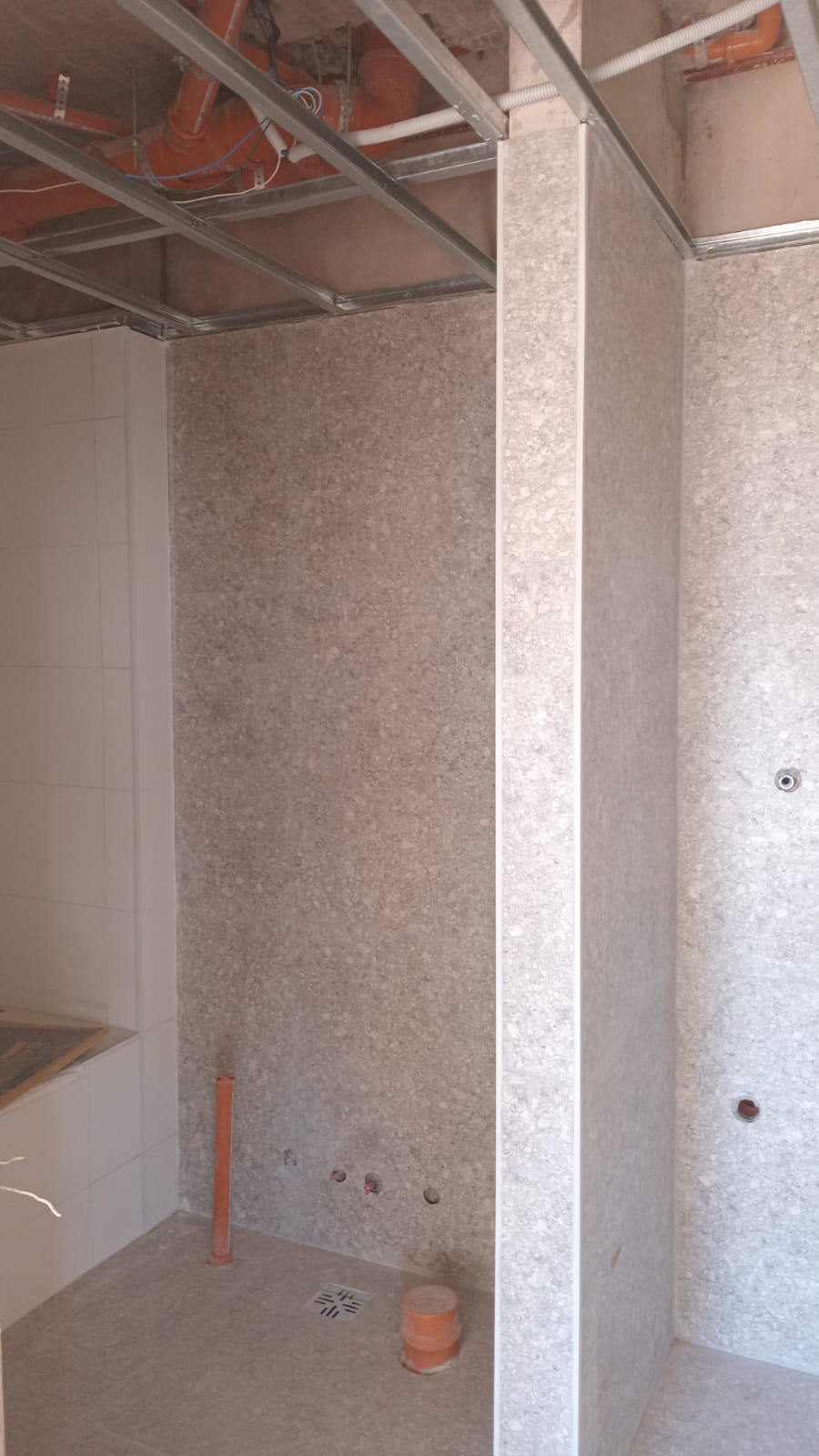 La mampostería fue ejecutada hasta el piso 12 en todas las unidades. Además, se aplicó revoque en baños y cocinas hasta el piso 8.