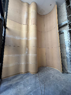 Terminaciones y detalles de durlock finalizadas en escalera, palieres y amenities. Se realizó el armado en doble altura de la planta baja con la instalación de luminaria. Se instaló revestimiento curvo de madera en doble altura.